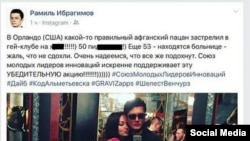 Вечером 13 июня Рамиль Ибрагимов, экс-ведущий программы "Перехват" на казанском ТК "Эфир" и президент Союза молодых инноваторов республики Татарстан, в своем Инстаграм написал следующее: "Какой-то правильный афганский пацан застрелил в гей-клубе на х*й 50 пид*ров. Еще 53 находятся в больнице — жаль, что не сдохли. Очень надеемся, что все же подохнут. Союз молодых лидеров инноваций искренне поддерживает эту убедительную акцию!"